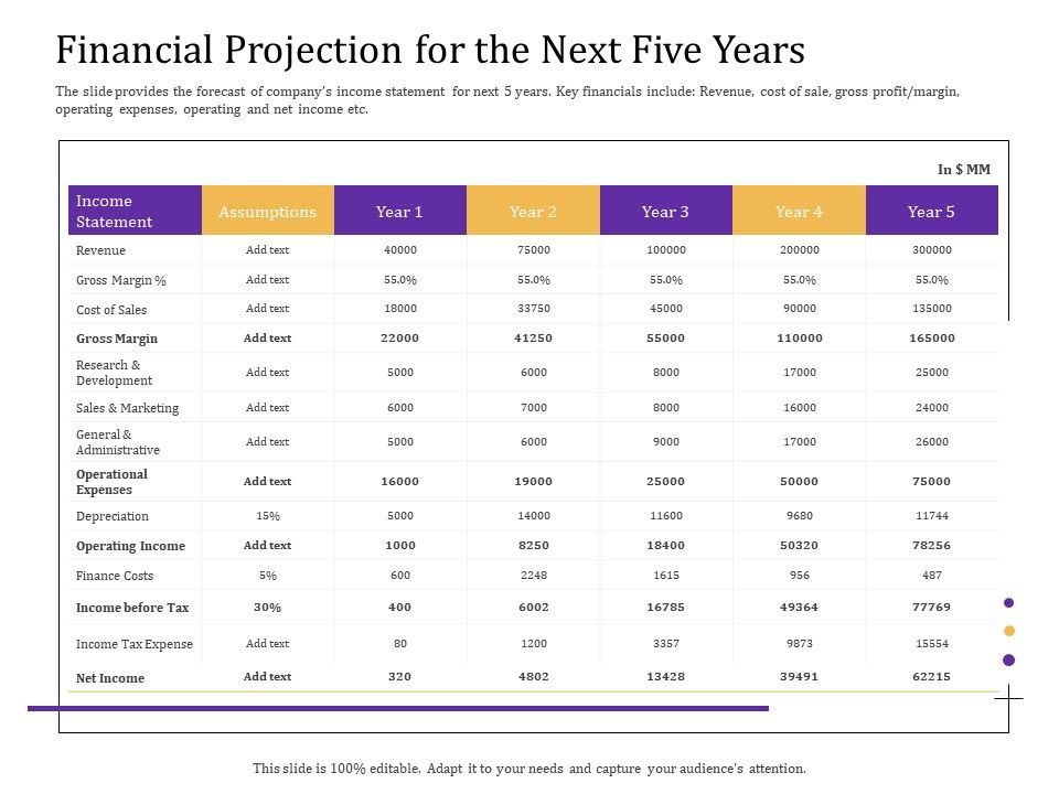 Here is a tabular financial PowerPoint template to compare your company’s financial projections for five consecutive years. Analyze investments, profits, sales, and expenditures in this detailed table to understand your wealth and its exhaustion.