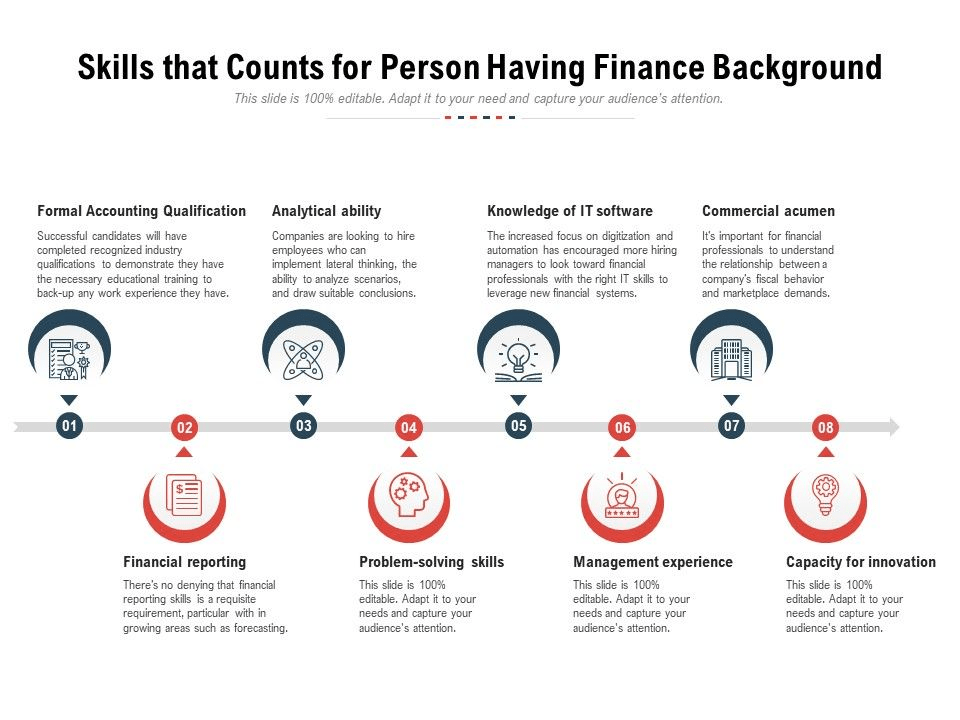 Here is a PowerPoint template to create awareness on skills that complement a finance employee. Highlight the critical personal, professional, or interpersonal skills required to excel as a finance professional using this PowerPoint template.