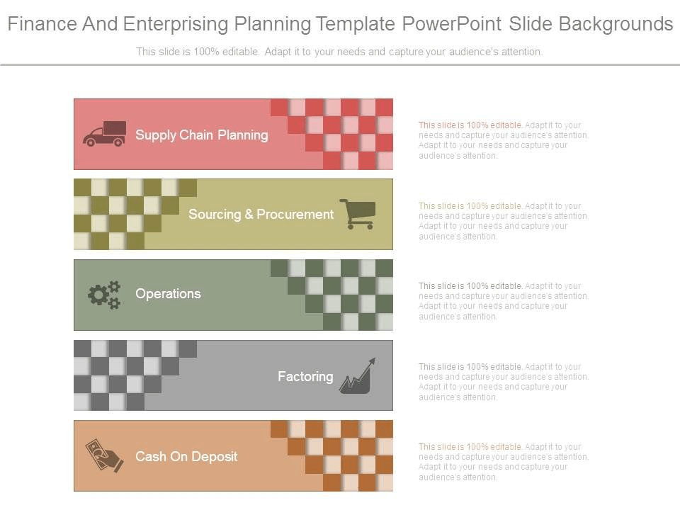 Demonstrate the key factors relevant to your finance and enterprise planning using this finance PPT template. Cover areas like supply chain planning, sourcing, procurement, operations, factoring, etc, to devise your best fit financial strategy using this PPT design.