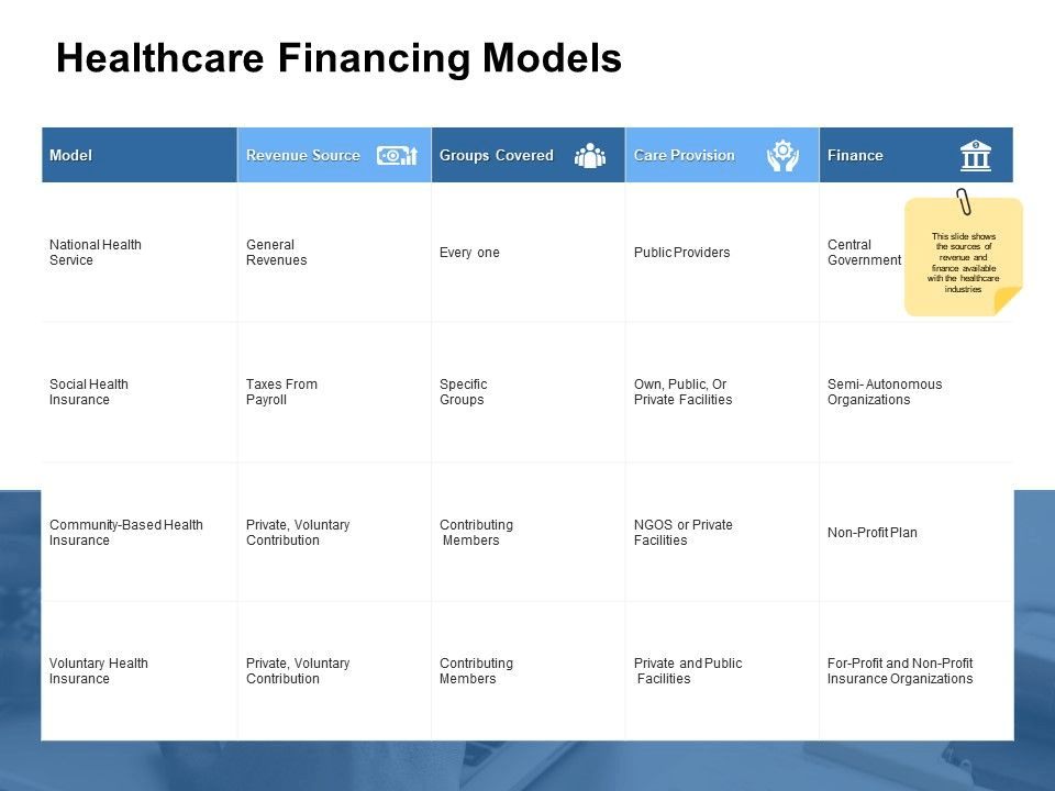Plan and demonstrate your healthcare financing model using this finance PPT presentation. Under the headings of the model, revenue source, groups covered, finance source, etc, you can analyze the management of wealth associated with your organization.
