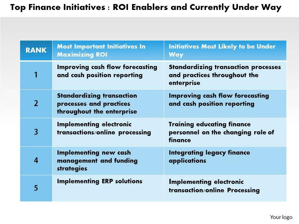 Here is a template to focus on the top financial initiatives concerning your organization. Rank them in order of importance in maximizing ROI and the initiatives that are most likely to be underway in the two-column table.