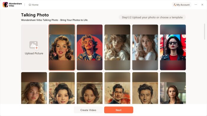 Step 2: Next, a prompt requesting you to select an image will come up. You can choose from the avatars displayed or click Upload Picture to import a photo from your local storage. Once done, hit the Create Video button at the lower right corner of the screen.
