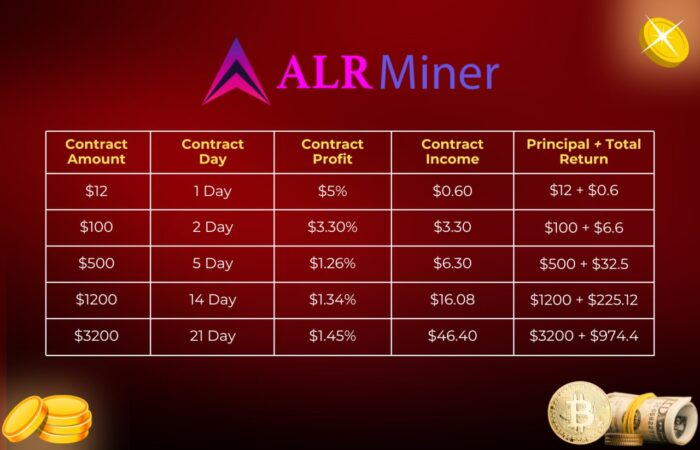 ALR Miner’s affiliate program provides an opportunity to make money without investment . By joining the affiliate program, you can receive a monthly salary of up to $30,000, with unlimited profit potential.