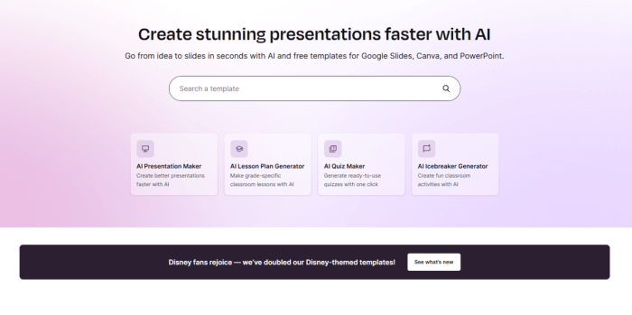 Slidesgo’s unique selling point is its template-first AI generation. The tool prioritizes aesthetics, helping you create beautiful presentations by applying its extensive library of stunning, curated templates to your generated content.