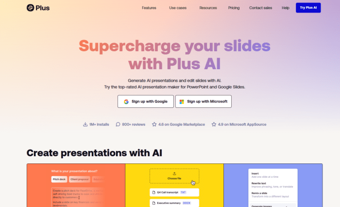 Plus AI is the perfect tool for anyone who already works in Google Slides or Microsoft PowerPoint. It’s not a standalone platform; it’s an add-on that brings AI power directly into your existing workflow.