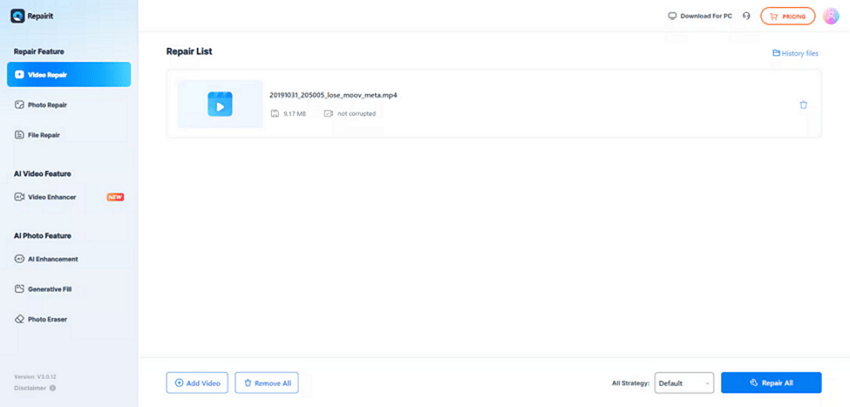 When the corrupted file is uploaded, it will be displayed within the interface. Now, locate and click the “Repair All” button to initiate the repair process. This will trigger the system to analyze and restore the MP4 files to their original functional state.