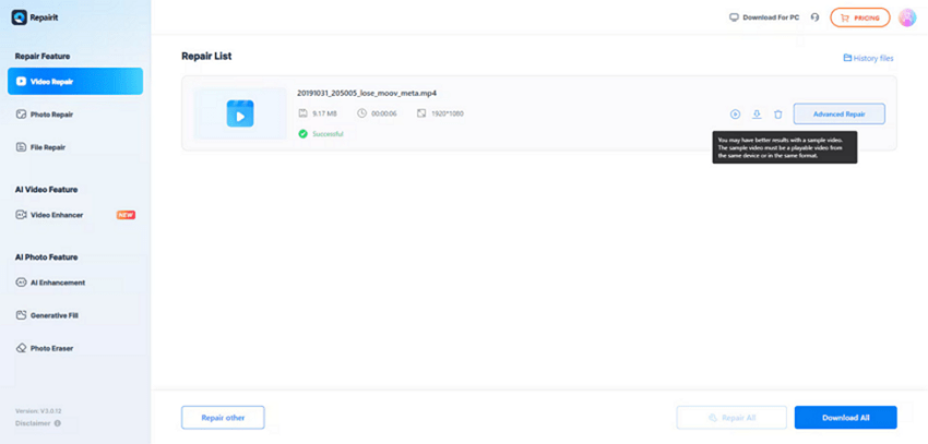 Once the repair process is finished, click the “Play” icon beside the repaired video to check the quality. When you are happy with the video quality, press the “Download All” button and store all fixed MP4 files on your device.
