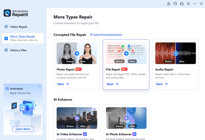 Step 1. Download and install Wondershare Repairit. Launch it and select “More Types Repair” from the left. Then, choose “File Repair.”