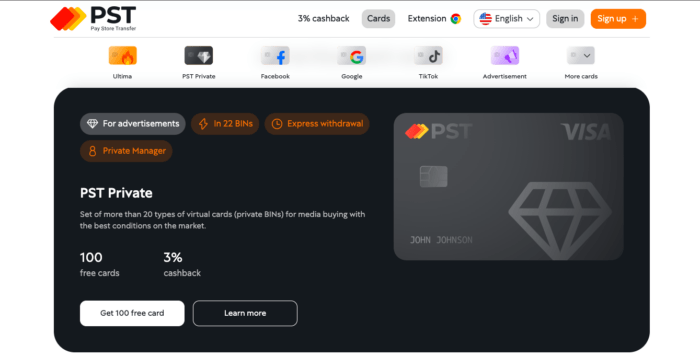 PSTNET’s virtual cards are specifically designed for media buyers, meaning they are pre-configured for seamless integration with advertising platforms. The service offers dedicated cards for all major platforms, as well as credit cards for ads with a 3% cashback feature, available under the PST Private program.