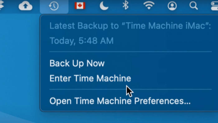 - Now, click the Time Machine icon from the menu bar located at the top and select Enter Time Machine. Alternatively, you can go through System Preferences > Time Machine to access it.