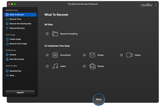 Step 1: Download and install the Stellar Data Recovery Professional software on your Mac. Launch the software and from the homepage, select the type of data you need to restore and click Next.