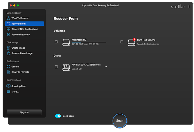 The Stellar Data Recovery Professional for Mac software allows you to restore deleted files from multiple storage devices, such as SD cards, USB drives, external hard drives, and more. The software supports recovery of deleted files in three simple steps, i.e., Select, Scan, and Recover.
