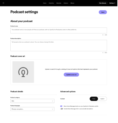 STEP 2. Click the Settings button in the top right corner and fill in your relevant podcast information.