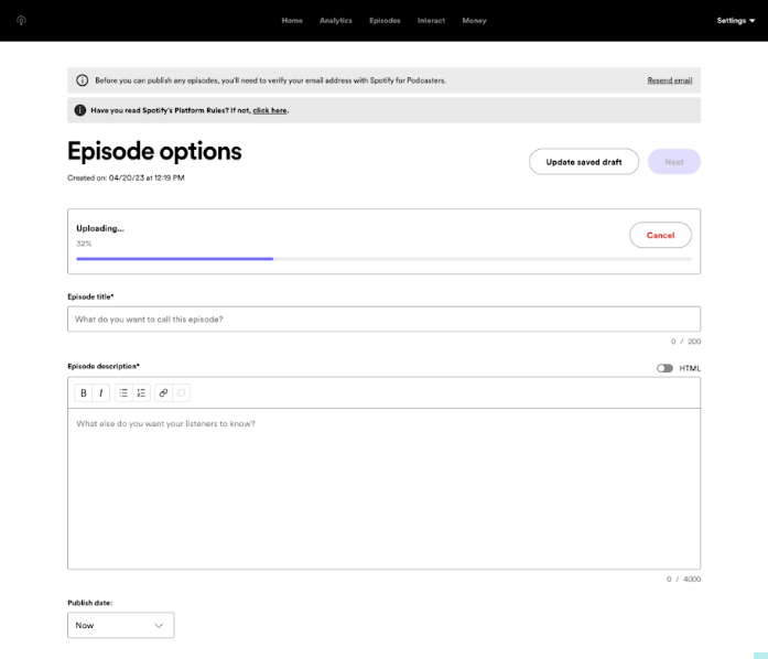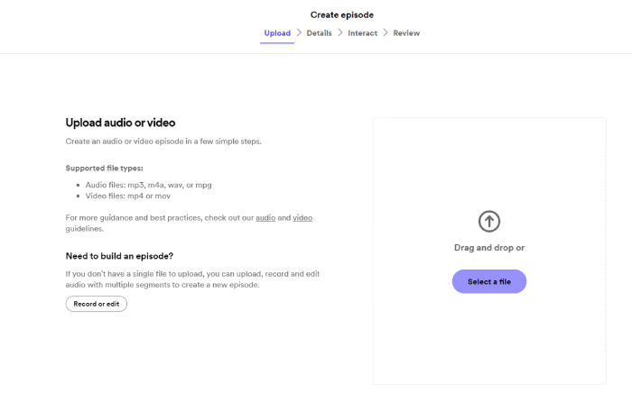 If you already have episodes to publish, choose to drag and drop or click Select a file to upload your show. If you haven’t started creating, select the Record or Edit button on Spotify to start creating your episodes.