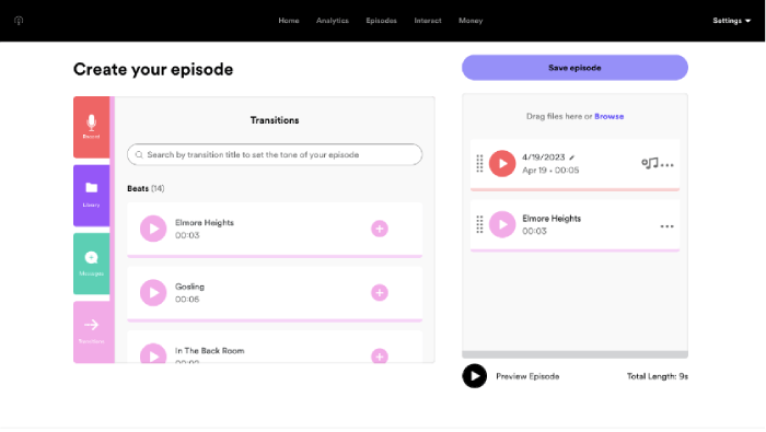 When you’re ready to create episodes on Spotify, you can record or upload relevant audio. Click Library to reuse previously uploaded audio or click Music to add songs from Spotify to your episode. You can also add voice messages and sound effects. Then, drag files from your computer or the tool to the left or click Browse to select the files you need.