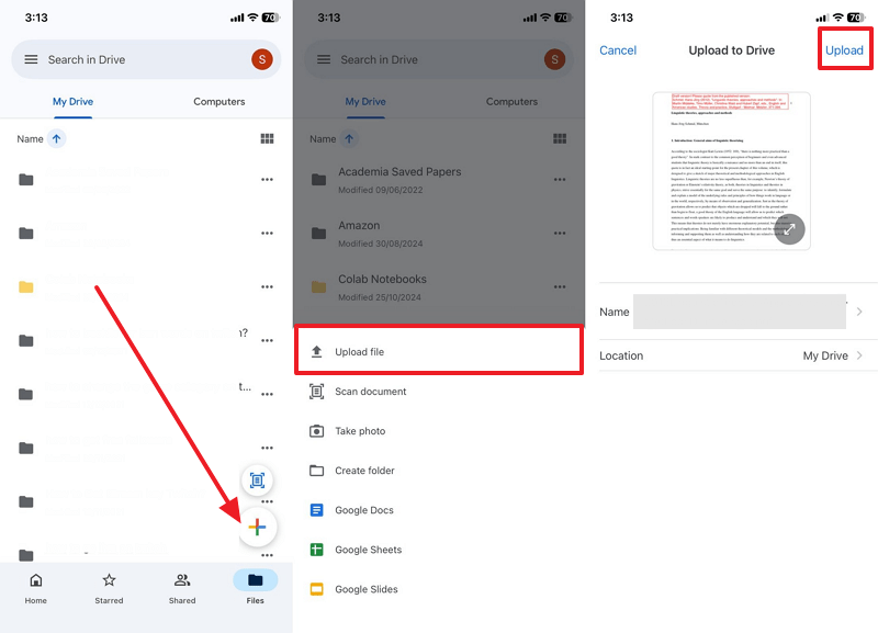 Step 1. Tap the “+” icon, choose the “Upload” button, and browse the file to share by pressing the “Upload” button.