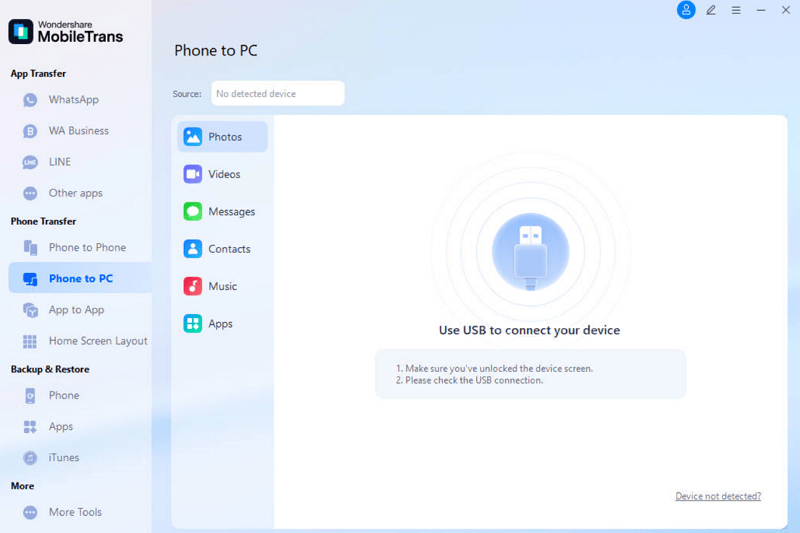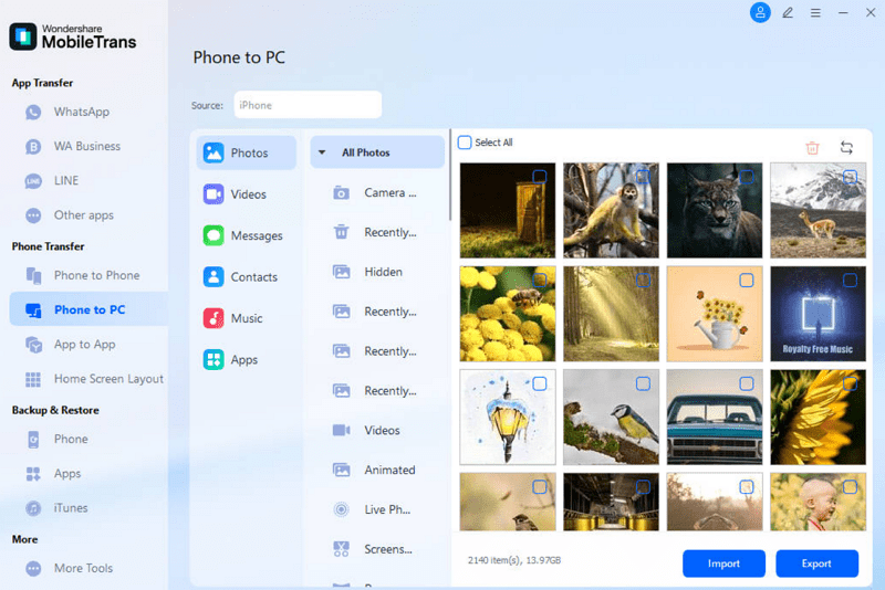 As an easy solution, MobileTrans allows you to share 5 data types, such as photos and videos, from iPhone to PC securely. While doing so, users can choose multiple data types and share data to a PC in bulk in just a few steps. Using this tool is simple for both beginners and professionals, and allows you to establish a secure USB connection.