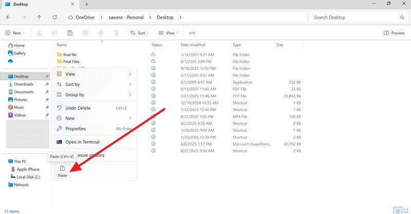 Step 2. In the chosen folder, paste the copied file by selecting the “Paste” option after right-clicking.