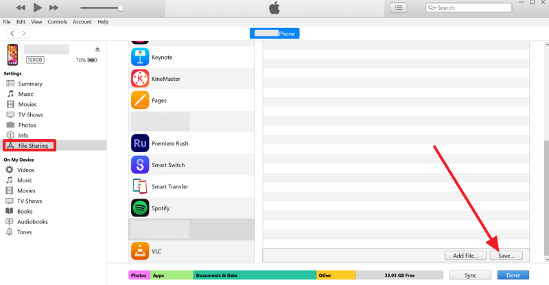 Instructions: After connecting the iPhone, go to the “File Sharing” tab on iTunes and select the app from which you want to export the file. Press the particular document, and scroll down to choose the “Save…” option.