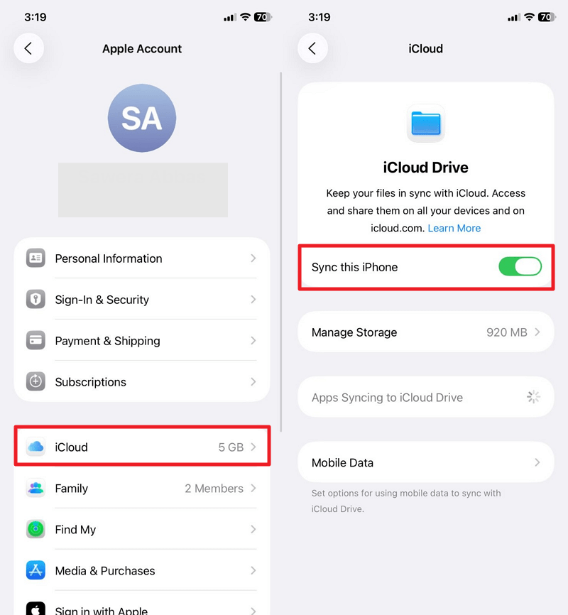 Step 1. Access the Apple ID settings, pick the “iCloud” option, and ensure “iCloud Drive” is enabled. Afterward, add the desired file to iCloud Drive by tapping on the “Share” option and choosing “iCloud Drive” from the Files app.