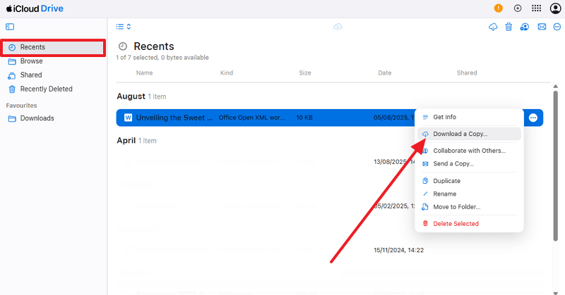 Step 2. Pick the uploaded file on iCloud drive as you sign in and tap the “Three Dots” icon to pick the “Download a Copy…” option from the “Recent” tab.