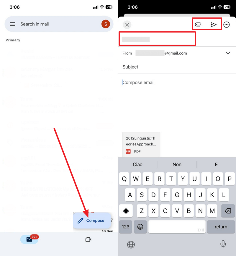 Step 1. From iPhone, hit the “Compose” button, attach the file, enter the receiver’s email, and tap the “Send” icon.