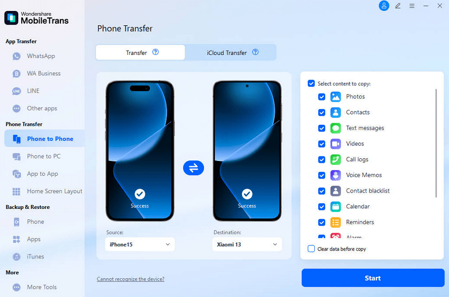 Next, select the “Message” option and tick the “Clear Data Before Copy” option if required to erase existing data on the destination phone. Now, specify the “Source” and “Destination” devices, then press the “Start” button to initiate the transfer.