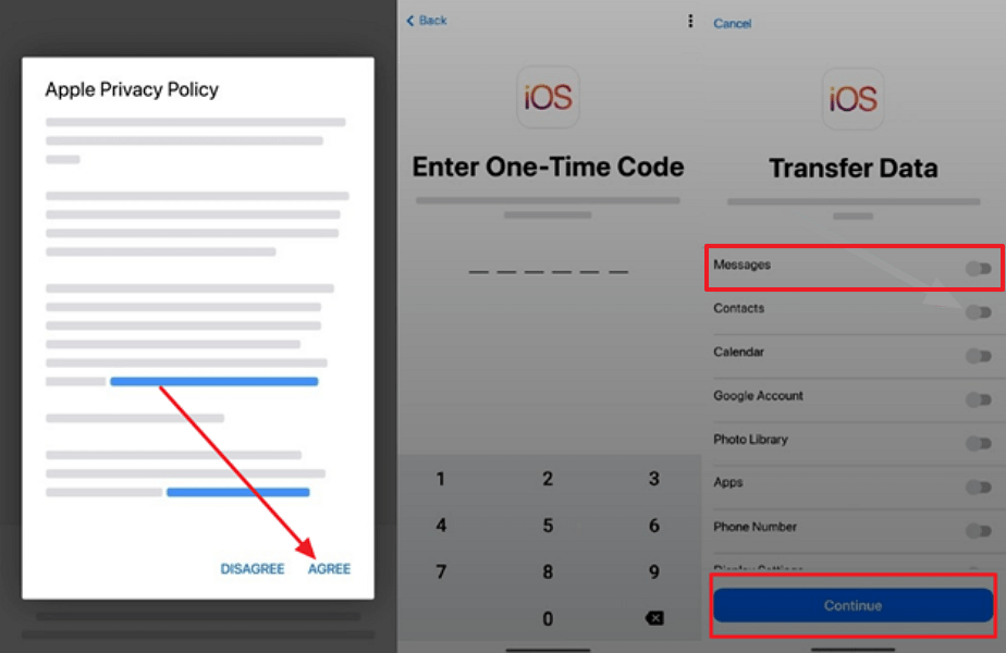 Step 2. On your Android, tap the “Agree” option to confirm the terms and conditions appearing on the prompt screen. Next, enter the 6-digit code, toggle the “Message” option, and then press the “Continue” button to begin migration.