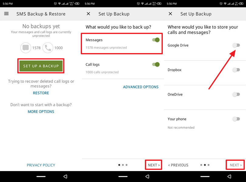 Step 1. Install the app on Android, press the “Set Up a Backup” button, and toggle the “Messages” option. Here, tap the “Next” option, enable “Google Drive” for backup storage, and then press “Next” again.
