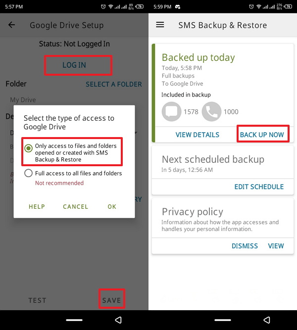 Step 2. Now, hit the “Log In” option and choose the first option from the prompt window, then press the “Save” option. Once done, tap the “Back Up Now” option and start the backup to your chosen location.