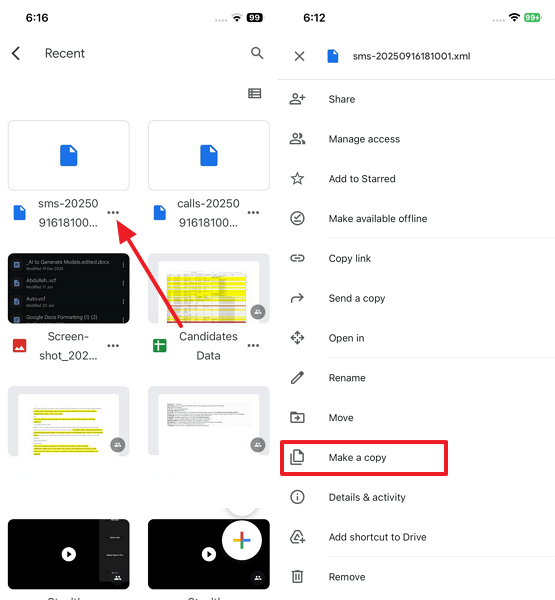 Step 3. Access Google Drive on your iPhone, log in with the same credentials, and reveal the SMS folder in your drive. Now, press the “Three Dots” icon and choose the “Make a Copy” option to store messages on your iPhone.