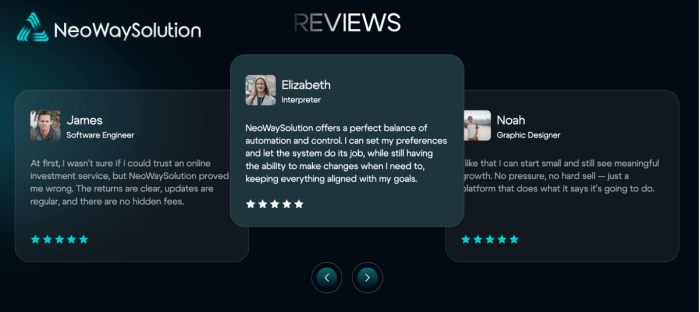User feedback shapes the reputation of any trading service. While reading a NeoWaySolution.net review, you often find comments about the smooth interface, supportive team, and calm design. Multiple NeoWaySolution.net reviews point out how easy it is to adapt to the platform, even for people who enter trading for the first time.