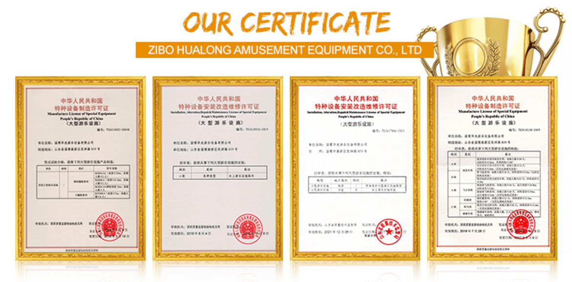Before I present the ride, let’s take a look at the company behind it. After all, amusement park rides have to withstand constant use, high torque, high G-force and heavy loads that vary for every ride. Any company that produces such activity level products must meet and go beyond the basic quality assurance standards. Zibo Hualong Amusement Equipment Co. Ltd. is one such company, and it presents a formidable array of quality assurance certificates that are maintained constantly. These are not just certificates for the show; these are corporate culture and way of production.