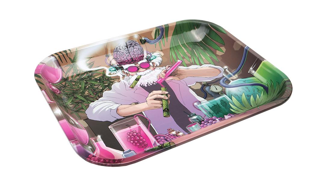 Rolling trays are a fundamental accessory for smokers. While many casual smokers may take a DIY approach to their trays, it is recommended for those who want to take their rolling to the next level to upgrade to a metal rolling tray. Metal rolling trays are highly functional, much more durable than the typical paper plate rolling tray, and more affordable than glass options. The Mad Scientist Rolling Tray by King Palm is large with a unique design, so it can even become a decorative element when not in use. This specific tray has an illustration of a mad scientist creating the next delicious King Palm flavor, all while smoking a huge blunt. The pinks and greens used in this artwork create an eye-catching and unique visual that anyone would be proud to show off. Smokers with a sense of humor will want to add one of these funny rolling trays to their weed accessory collection.