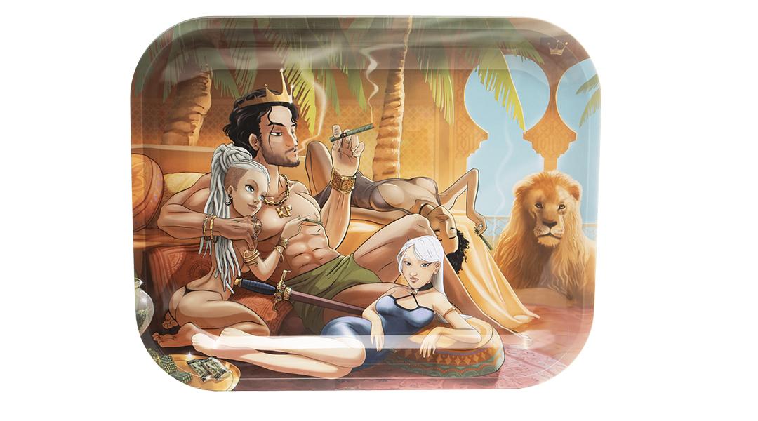 The King Palm company has so many dope rolling trays, especially The Kingdom Large Rolling Tray. Choosing a rolling tray comes down to personal preference and making a statement about a smoker’s personality. This tray features a full color, custom piece of illustrative art that is fit for all kings, queens and nonbinary royalty! This large rolling tray will certainly become a centerpiece in the royal smoker’s kingdom between sessions—either to display as an art piece or to use to store all of your accessories. This large footprint allows for a larger workspace, and the opportunity to roll multiples, if that is what is desired.