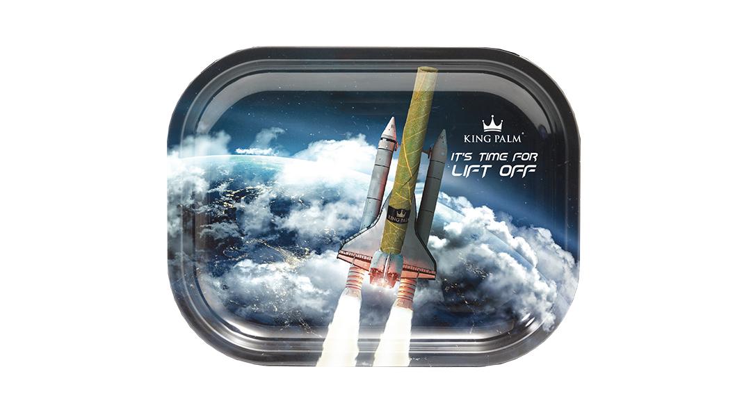 Cool rolling trays don’t have to be expensive! When it’s time for lift off, reach for this affordable, small, metal rolling tray. A durable rolling tray is important, and this small metal tray is the perfect choice for someone who wants to keep their herbs, grinder, papers, and more all in one place without taking up too big of a footprint in their home or in their backpack. The photo-realistic image on this tray features a King Palm pre-rolled cone blasting off into outer space, creating a fun backdrop for the next session.