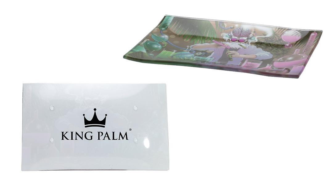 King Palm has several Trippy rolling trays, specifically the Mad Scientist Glass Tray – Shatter Resistant. This brightly colored design features a mad scientist concocting a King Palm flavor. Expert rollers would be crazy not to want to add this tray to their collection! Rolling trays made of glass are some of the best rolling trays because the glass material provides a smooth working surface. A smooth surface makes for easier rolling and ultimately allows for smoother, higher-quality joints. The smooth curvature of this design also makes sure any dropped herbs are caught for reuse, so nothing goes to waste! Since this glass rolling tray is shatterproof, it will be a perfect way to keep organized, long-term. Even when not being used for storing a grinder, papers or bud, this tray is a nice way to store keys or jewelry. Lastly, glass trays are simple to keep clean—just soak in hot water with soap and built-up residue will easily wipe away.