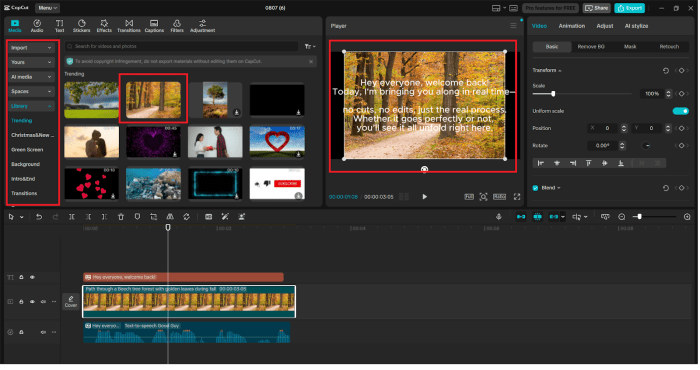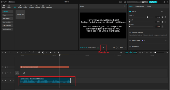 After your voiceover is complete, you drag it into the timeline. After that, match up your visual clips or your still images with the narration. CapCut’s simple timeline ensures that it is easy to trim and put content in the right place. Add necessary on-screen text, effects, or animations to enhance the viewer’s experience.