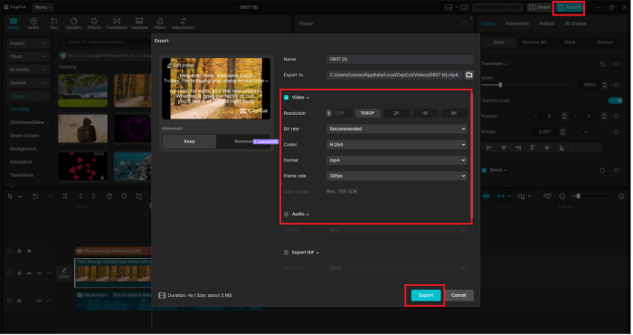 When it all appears and sounds as you want it to, hit “Export” in the upper-right-hand corner. Select the resolution of your choice- that may be HD or even 4K in case you require that. You are able to export a preview to review by the team or even use the version as your final video.