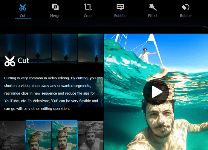 On the other hand, VideoProc can edit, cut, and merge videos of unlimited size. It can edit 4K or large videos, with limitless input and output format.