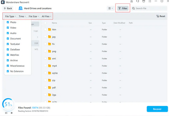 The tool allows you to pinpoint, filter, and select the required files. Enable either of the ‘All Files’, ‘Time’, ‘File Type’, and ‘File Size’ options for retrieving the selected data. The refined set of files shows up on the program screen.